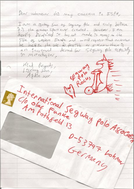 Yesterday we received this lovely letter from a real SegwayPolo fan from the United Kingdom, Manchester. We would like to say thank you. That´s why we are desperatly seeking Aydin. Who knows this person?